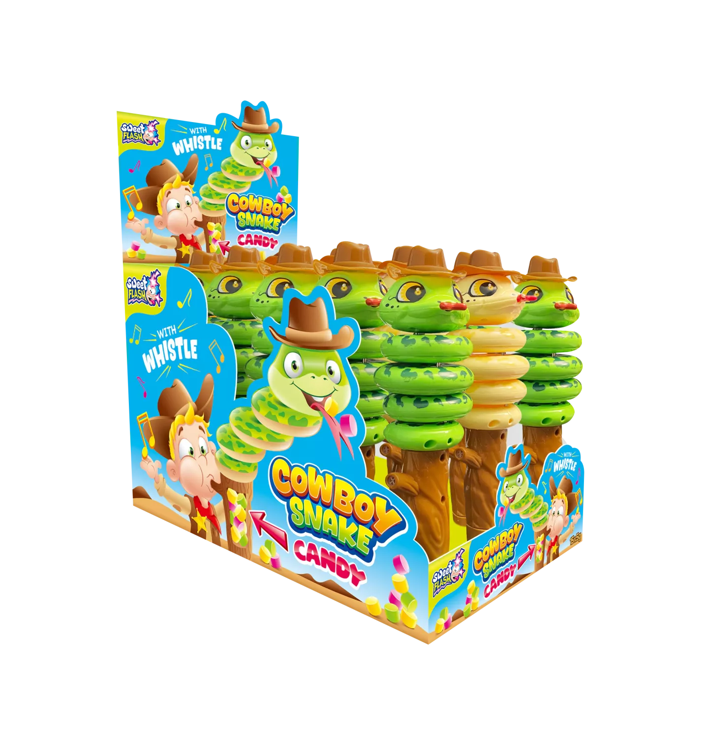 Cowboy Snake bjuder på godis i handtaget, en inbyggd visselpipa och en vild västerndesign. Perfekt som en liten överraskning, present eller minnessak för alla cowboy-fans